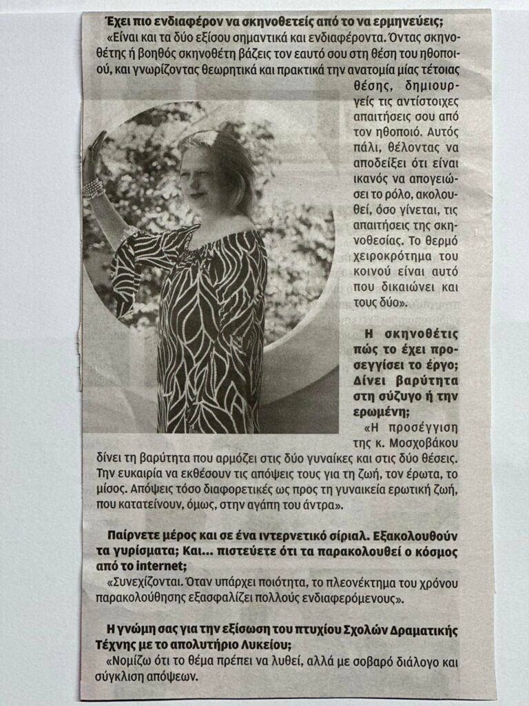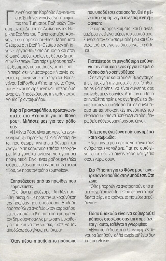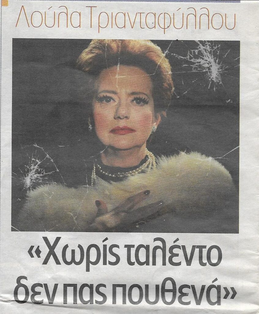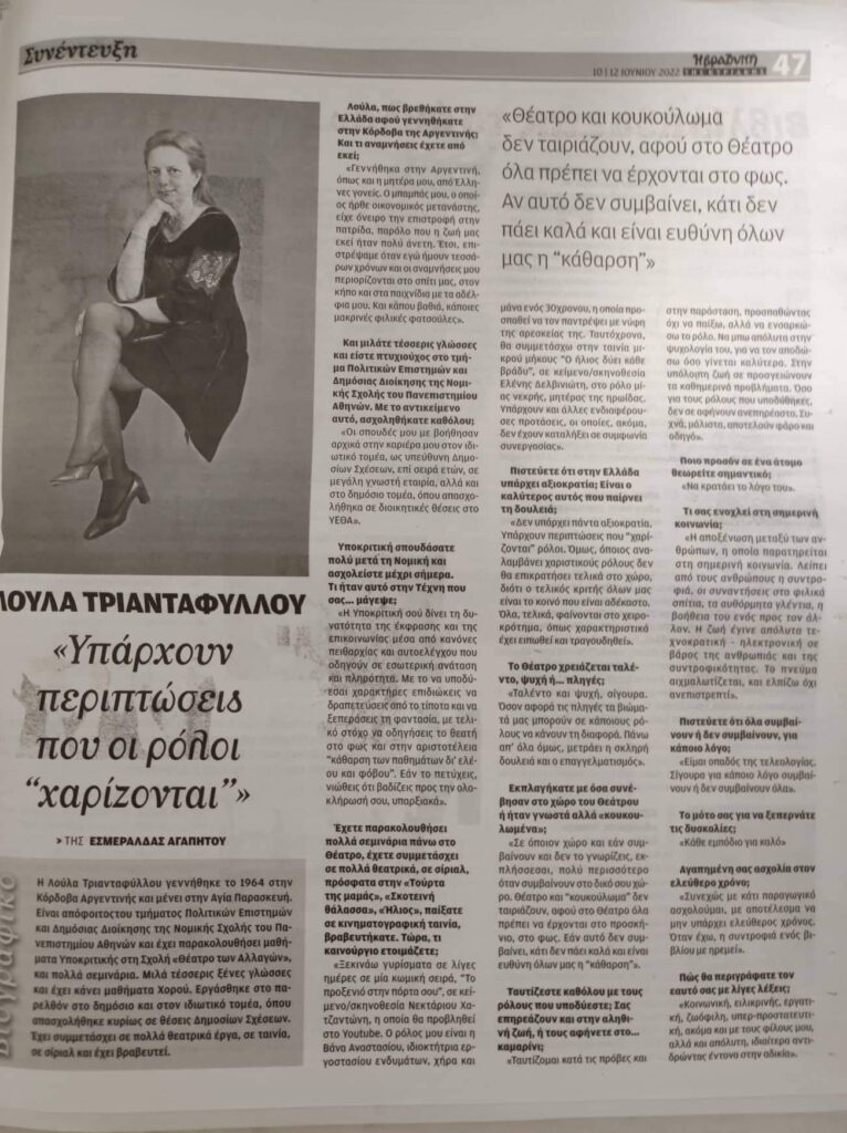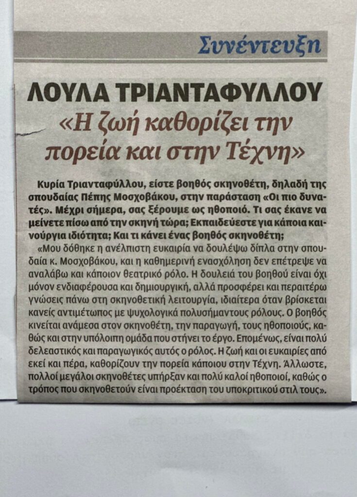 ΣΥΝΕΝΤΕΥΞΕΙΣ Συνέντευξη στη "Βραδυνή" της Κυριακής Η Λούλα Τριανταφύλλου μιλάει εφ' όλης της ύλης Συνέντευξη στην δημοσιογράφο Εσμεράλδα Αγαπητού για την "ΒΡΑΔΥΝΗ" Λούλα Τριανταφύλλου: «Το χιούμορ δίνει ζωή» Συνέντευξη στο δημοσιογράφο Νίκο Μόσχοβο και στον «Τυπολόγο» Διαβάστε το άρθρο και την συνέντευξη εδώ. Συνέντευξη στη Blogger-Αρθογράφο Λυδία Καραθανάση και στο «Koukidaki» Διαβάστε το άρθρο και την συνέντευξη εδώ. Λούλα Τριανταφύλλου και Πάνος Τσαλιγόπουλος ψάχνουν την "Υποπτη για τον Φόνο" στο Θέατρο Βαφείο. Διαβάστε το άρθρο και την συνέντευξη εδώ. Συνέντευξη στην εφημερίδα "Η Βραδυνή" για την θεατρική παράσταση "'Υποπτη για τον φόνο μου" Συνέντευξη για τον "ΑΥΛΟΓΥΡΟ" από τον Παύλο Ανδριά Διαβάστε το άρθρο και την συνέντευξη εδώ. H Λούλα Τριανταφύλλου μιλάει στο All4Art. Η ΨΕΥΤΟΫΠΗΡΕΤΡΙΑ ΤΟΥ ΠΙΕΡ ΝΤΕ ΜΑΡΙΒΩ ΣΕ ΣΚΗΝΟΘΕΣΙΑ & ΔΙΑΣΚΕΥΗ ΖΑΧΑΡΙΑ ΡΟΧΑ ΣΤΟ ΘΕΑΤΡΟ ΒΑΦΕΙΟ ΛΑΚΗΣ ΚΑΡΑΛΗΣ. Διαβάστε το άρθρο και την συνέντευξη εδώ.